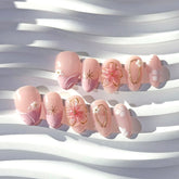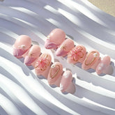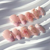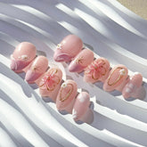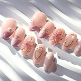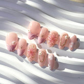 Meticulously crafted with luxury and artistry in mind, Petal Kiss is a designer-style press-on nail set that embodies sophistication and intricate detailing. This set features a creamy nude pink base, adorned with hand-sculpted 3D floral embellishments, delicate petal outlines, and refined gold accents—all brought together to create an effortlessly elegant statement.