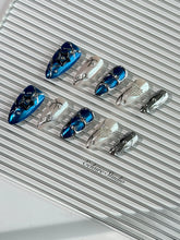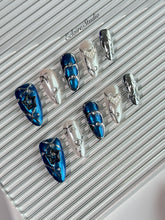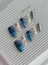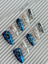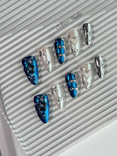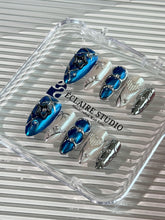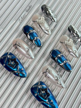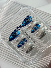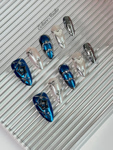 Stellar Circuit is a bold, futuristic manicure that fuses deep metallic blue with high-shine chrome silver. Featuring intricate star cutouts, 3D hardware accents, and sleek panel-like contours, this set feels like a piece of wearable space armor. Every detail reflects light like stardust, making it perfect for anyone who craves statement nails with a cosmic edge.