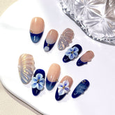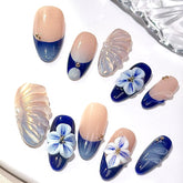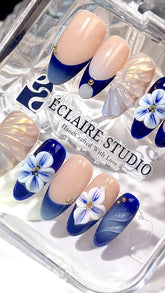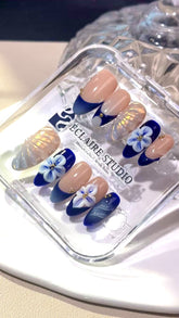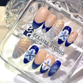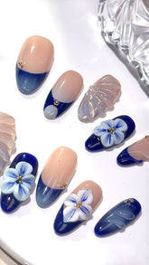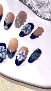 Midnight Bloom is the perfect blend of sophistication and artistry. This deep navy and nude-toned press-on nail set is designed for chic, confident individuals who embrace the 3D flower trend without the typical girly pink aesthetic. With hand-sculpted floral accents, sleek French tips, sunset glazed details, this set is both refined and fashion-forward.
