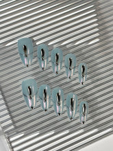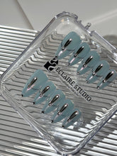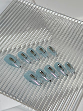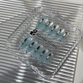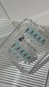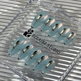 Dive into ethereal beauty with Siren's Whisper, a captivating set that combines the calm of the ocean with the allure of shimmering gemstones. Featuring a soft blue pearl-glazed base, each nail is adorned with a sleek metallic centerpiece and delicate gemstones, creating a mesmerizing look that catches the light with every move.
