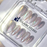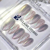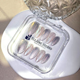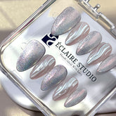 Inspired by the celestial glow of the night sky, Moonbeam is a futuristic yet ethereal press-on nail set that captures the essence of moonlight and cosmic elegance. Featuring a holographic silver cat-eye shimmer, this design shifts beautifully under the light, creating a mesmerizing sparkle. The look is completed with hand-sculpted 3D chrome waves, adding depth and texture for an ultra-modern, space-age aesthetic.
