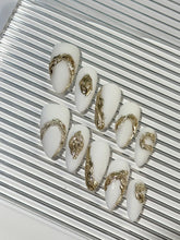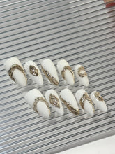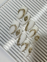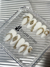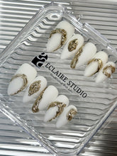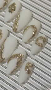 Aphrodite, a design inspired by the Greek goddess of beauty, love, and elegance. This set features a matte white base, symbolizing purity and grace, adorned with flowing 3D gold strokes that shimmer like the golden touch of Aphrodite herself. Each nail captures the essence of divine elegance, transforming your fingertips into a canvas of celestial beauty.