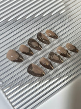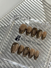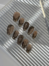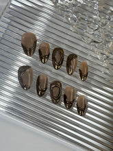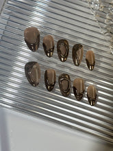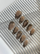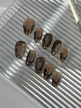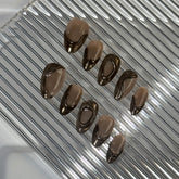 Molten Muse is a bold study in contrast and flow. Featuring a nude base and warm, abstract metallic strokes, this short almond set channels the look of liquid metal wrapped around soft earth tones. The organic curves and high-gloss finish create a sophisticated, sculptural statement for the modern muse.