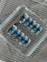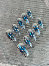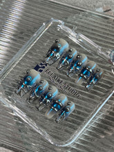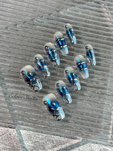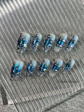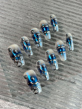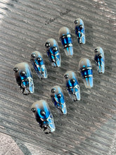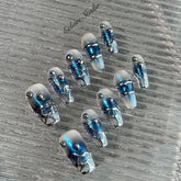 Cyber Gleam fuses sleek metallic hardware with a luminous blue ombré glaze for a look that’s part sci-fi fantasy, part couture statement. Each nail is adorned with sculpted chrome details and reflective accents, giving off a bold, high-shine finish that catches every light.