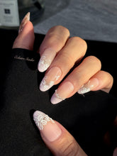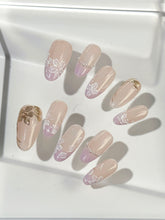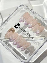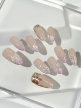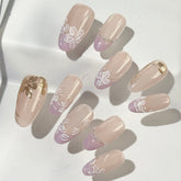 Step into a garden of grace with Lilac Bloom—a soft and romantic design that captures the elegance of early summer. Featuring delicate light lilac French tips on a blush-toned base, this set is adorned with hand-painted white floral accents and touches of gilded gold blossoms, creating a look that’s equal parts dainty and luxurious. With a sprinkle of pearl accents, Lilac Bloom radiates timeless femininity.