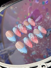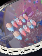 A seamless pink and blue ombré reflects the ripening of spring berries against a clear afternoon sky, while 3D sculpted flowers and crisp French tips echo the delicate growth found in a private estate garden. Swirled textures add a decorative, airy touch, completing a look that feels both fresh and sophisticated.