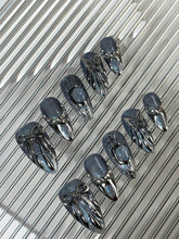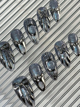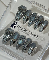 Embrace the mystery of the night with Eclipse, a mesmerizing masterpiece that captures the allure of darkness and light. This set features a deep, cat-eye blue base adorned with 3D metallic accents, including elegant bows, crescent moons, and butterfly motifs. Each nail is a work of art, combining the brilliance of chrome with the mystique of midnight..