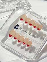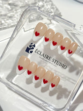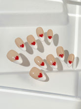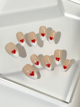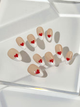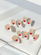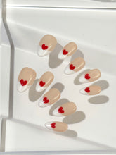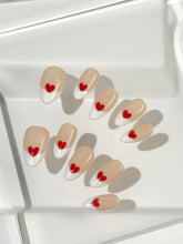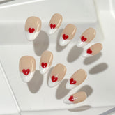 Sweetheart Tips blends timeless charm with a playful wink. Set on a soft nude base, this modern take on the French manicure features crisp white tips kissed by hand-painted red hearts. It's the perfect balance of classic and cute—simple, romantic, and ready to steal hearts.